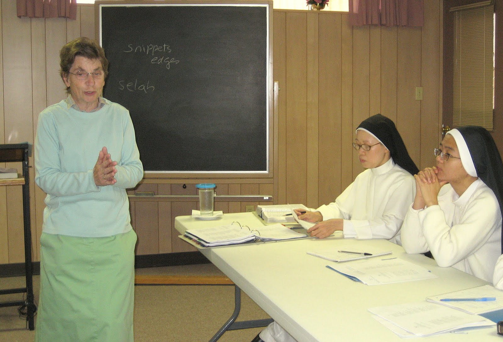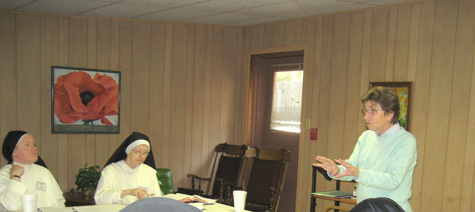 Sr. Maria Teresa (Summit, NJ) explains to the seminar about the \”Materialists, the Idealists, and the Reconciled\” while Sr. Joseph Maria (Summit) and Sr. Mary John look on.