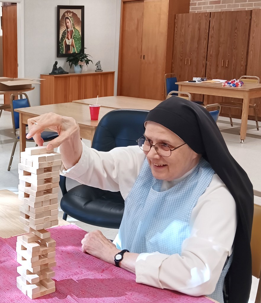 Afterwards, we gathered in the community room to play games. We have our regular favorites, and this year some of the sisters tried their luck at Jenga.