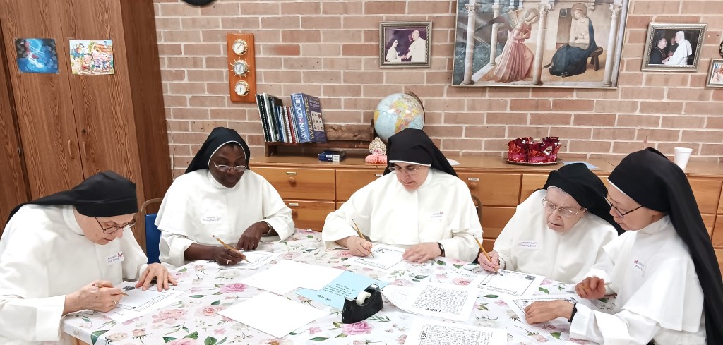Sr. Mary Rose in deep conversation with Sr. Miriam…who’s working on her word find puzzle.