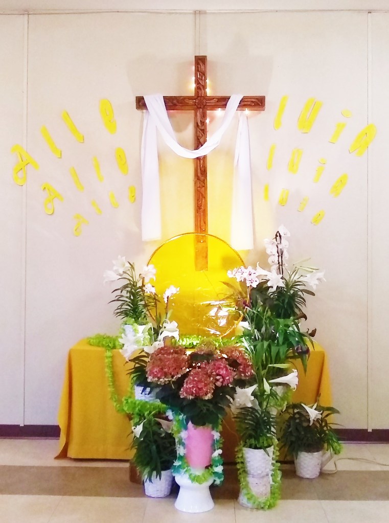 At the head of the refectory, the novitiate put up an elaborate display with an Easter cross surrounded by flowers.